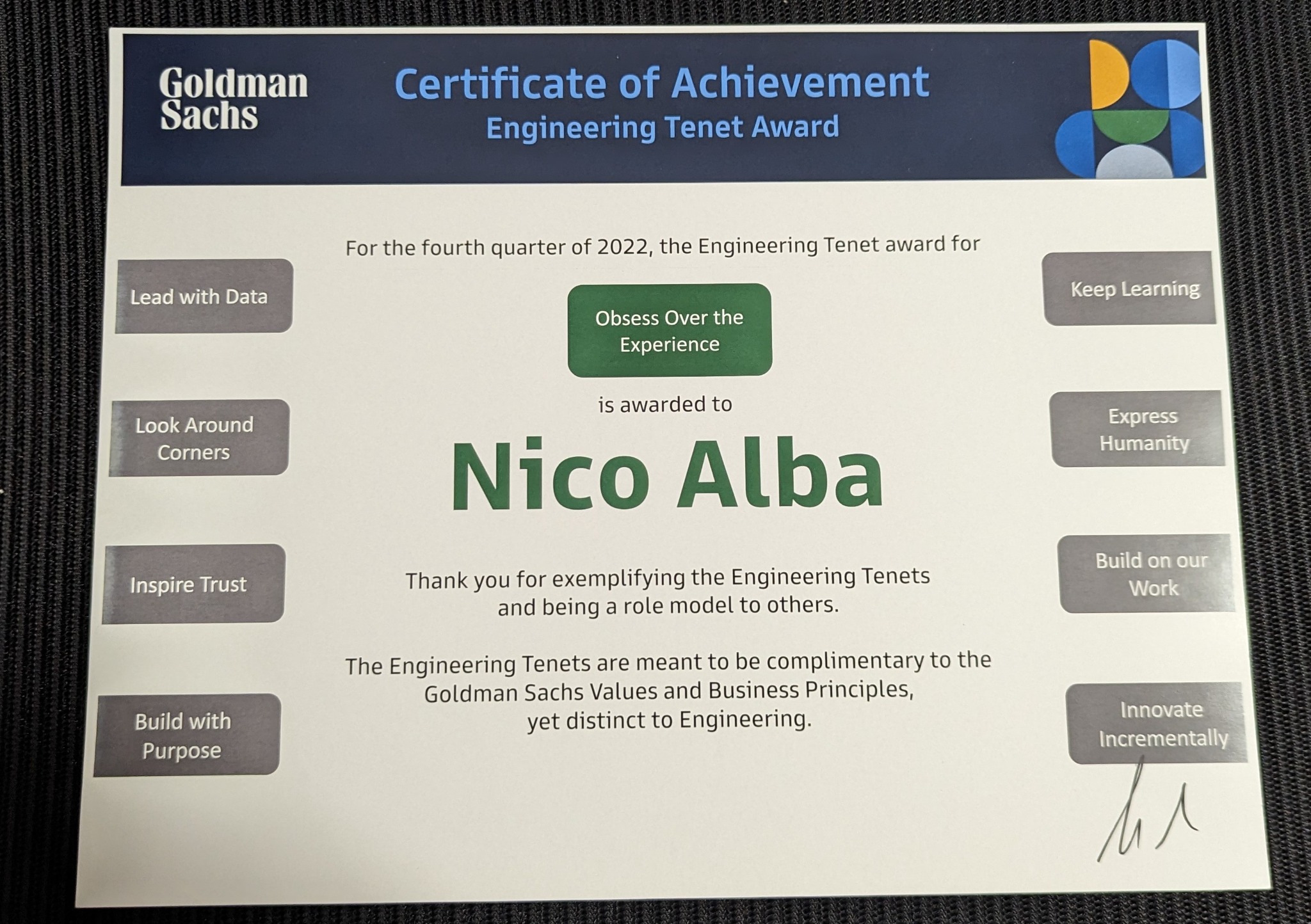 GS Engineering Tenet award I received during my time at Goldman Sachs.